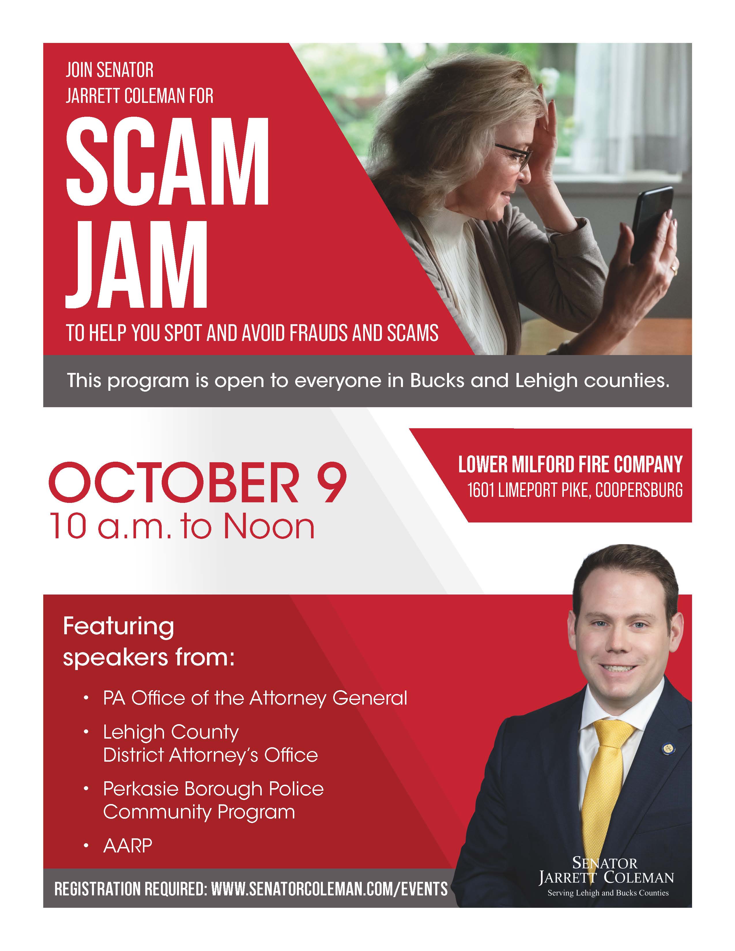 HomeResourcesNews Senator Coleman Scam Jam Event Overview Thursday, October 9 10:00—12:00 PM Sep 29, 2025 General News General News All Articles Recent Articles Road Closure - East Creamery Former Hilltown Township Supervisor Passes Senator Coleman Scam Jam Resources Act 537 - On-Lot Disposal Bucks Co. Municipal Dashboard Calendar Deep Run Valley Sports Association Documents, Forms & Permits Historical Society of Hilltown Township HT3 - PA 309 Connector Maps News Site Map Feedback Website Disclaimer Hilltown Township Administration Building 13 West Creamery Road, Box 260 Hilltown, PA 18927 Phone: (215) 453-6000 Fax: (215) 453-1024 info@hilltown.org Office Hours7:30 am - 4:30 pm, Monday - Thursday Hours: Friday's only8:00 am - 12:00 pm View Contact & Directory
